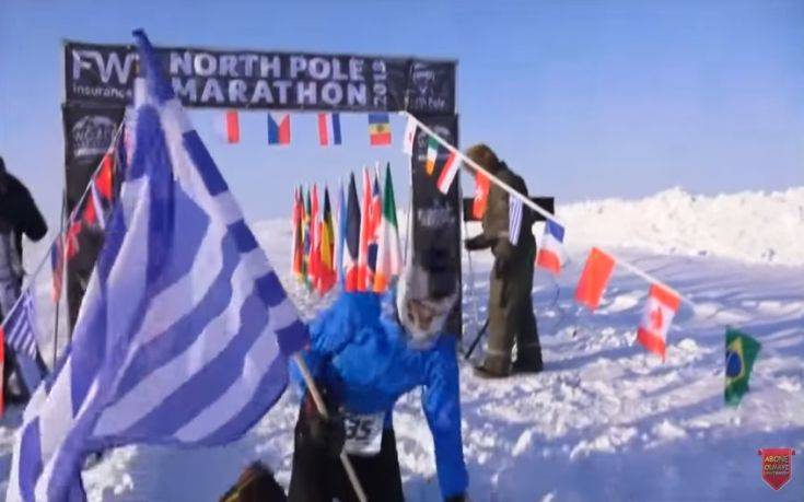 Κρατώντας την ελληνική σημαία, εξαντλημένος και… παγωμένος έφτασε στον τερματισμό.