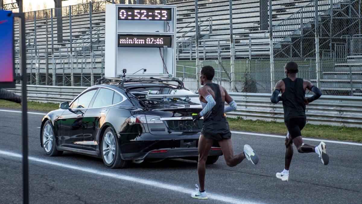 Το αυτοκίνητο είναι υπερβολικά κοντά στον Kipchoge με τεράστιο ανεμοθραύστη χρονόμετρο….