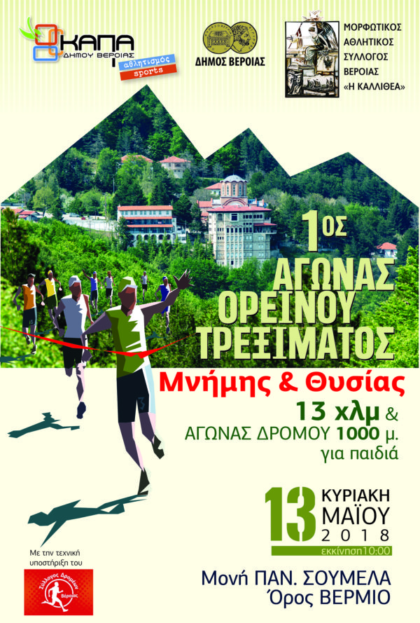 Ο Μορφωτικός Αθλητικός Σύλλογος “Η Καλλιθέα” Βέροιας σε συνεργασία με το ΚΑΠΑ του Δήμου Βέροιας και την τεχνική υποστήριξη του Συλλόγου Δρομέων Βέροιας, ανακοινώνει την διεξαγωγή του 1ου Αγώνα Ορεινού Τρεξίματος “ΜΝΗΜΗΣ ΚΑΙ ΘΥΣΙΑΣ”, 13χλμ την Κυριακή 13 Μαΐου 2018.