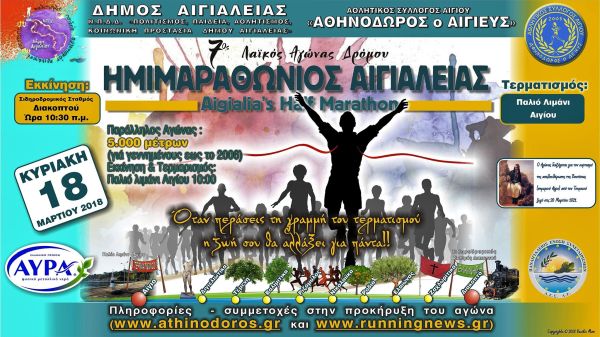 Ο Αθλητικός Σύλλογος Αιγίου «ΑΘΗΝΟΔΩΡΟΣ Ο ΑΙΓΙΕΥΣ», με την υποστήριξη του Νομικού Προσώπου Δημοσίου Δικαίου με την επωνυμία «ΠΟΛΙΤΙΣΜΟΣ – ΠΑΙΔΕΙΑ – ΑΘΛΗΤΙΣΜΟΣ & ΚΟΙΝΩΝΙΚΗ ΠΡΟΣΤΑΣΙΑ ΔΗΜΟΥ ΑΙΓΙΑΛΕΙΑΣ», διοργανώνει τον 7ο Λαϊκό Αγώνα Δρόμου – Ημιμαραθώνιο Αιγιαλείας, καθώς και παράλληλο αγώνα 5 χλμ.