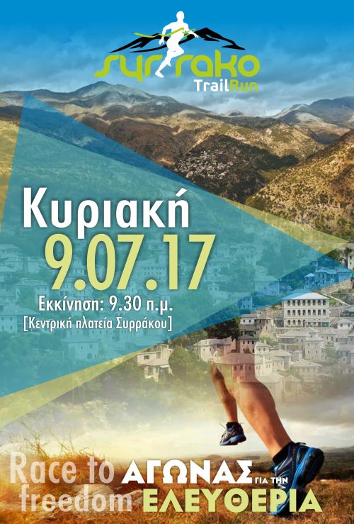 Η Τοπική Κοινότητα Συρράκου του Δήμου Βορείων Τζουμέρκων, με συνδιοργανωτές τον Ορειβατικό Όμιλο Συρράκου (ΟΡ.Ο.Σ.), τον Σύλλογο Δρομέων Ιωαννίνων και τις Τουριστικές Επιχειρήσεις Συρράκου, στα πλαίσια των 1ων Ορεινών Αγώνων Συρράκου (Syrrako Trail Run), διοργανώνει την Κυριακή 9 Ιουλίου 2017 ορεινό αγώνα με την ονομασία «Αγώνας για την Ελευθερία» – «Race to Freedom».