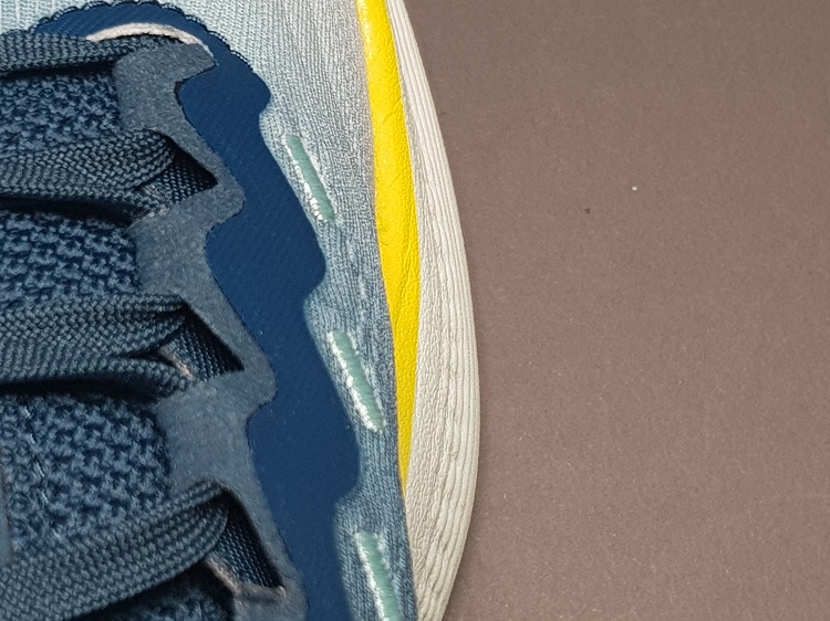 The midfoot is well reinforced, with an internal fabric band, as extension of the eyelets, connecting to the base on each side. At the same time, a firmer material has been placed around the wide eyestay.