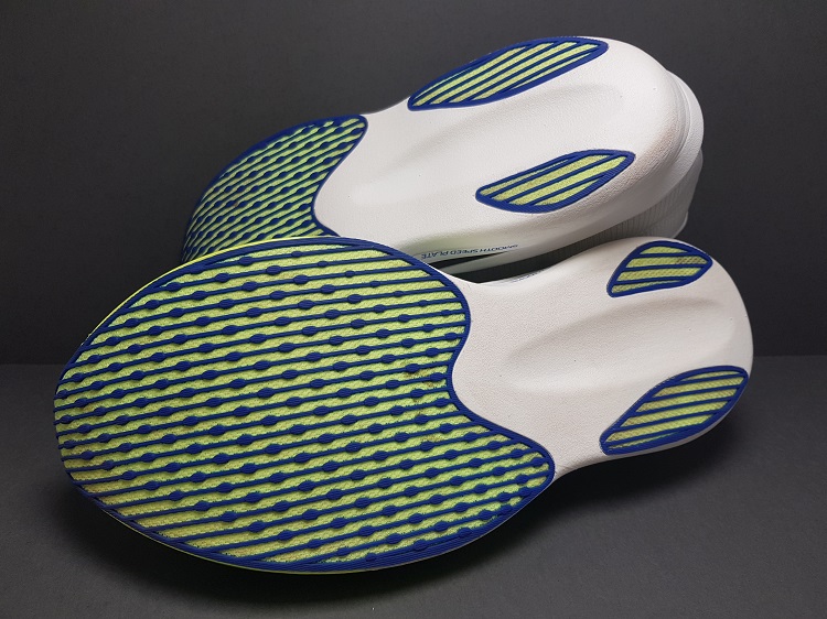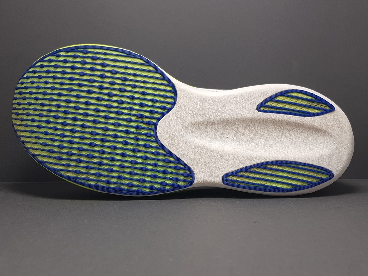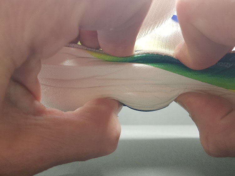 Η σόλα αποτελείται από δύο στρώσεις υλικών, με τον συνδυασμό τους να ονομάζεται όπως και πριν Enerzy XP. Η επάνω είναι από Peba και η κάτω από TPEE. Softness και ελαστικότητα από την πρώτη, ανθεκτικότητα και σταθερότητα από την δεύτερη. Πιέζοντάς τους με το χέρι πάντως, πολύ μαλακοί δείχνουν και οι δύο αφροί. Το ίδιο και στον δρόμο.