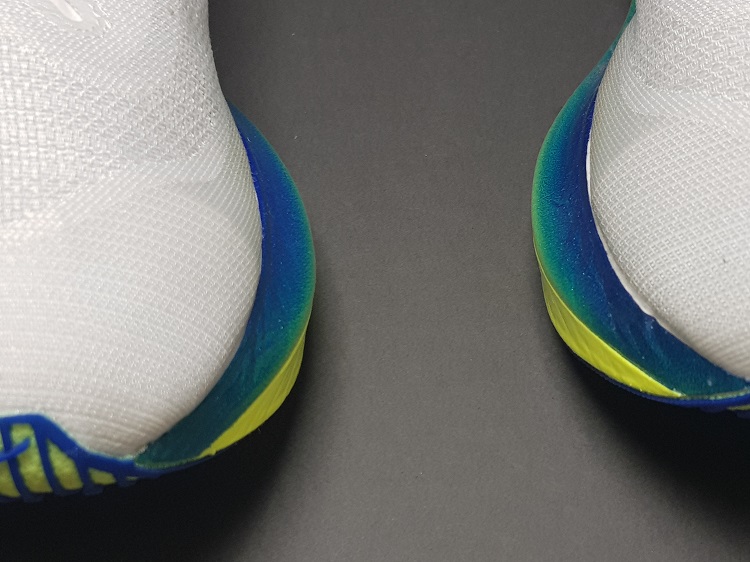 Αυτό φαίνεται ξεκάθαρα και από την γεωμετρία της σόλας. Εξωτερικά, ανοίγει και γεμίζει περισσότερο στο midfoot για να υποστηρίξει τον αρχικό υπτιασμό του ποδιού κατά την προσγείωση. Μετά, καθώς το transition κεντράρεται και οδηγείσαι στην απογείωση, έχουμε ένα πολύ φαρδύ και πομπέ αποτύπωμα εσωτερικά, ώστε να περάσει στο μεγάλο δάχτυλο όλη η δύναμη. Αυτές είναι θεωρητικά οι διαδοχικές φάσεις στήριξης και ώθησης κατά τον διασκελισμό και βάσει αυτών έχει σχεδιαστεί το παπούτσι. Να σημειώσουμε ωστόσο ότι όλο αυτό αφορά ένα απόλυτα δρομικό form, συνθήκη όχι δεδομένη στον μέσο δρομέα.