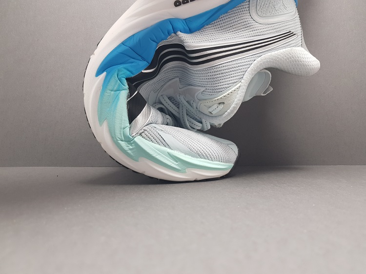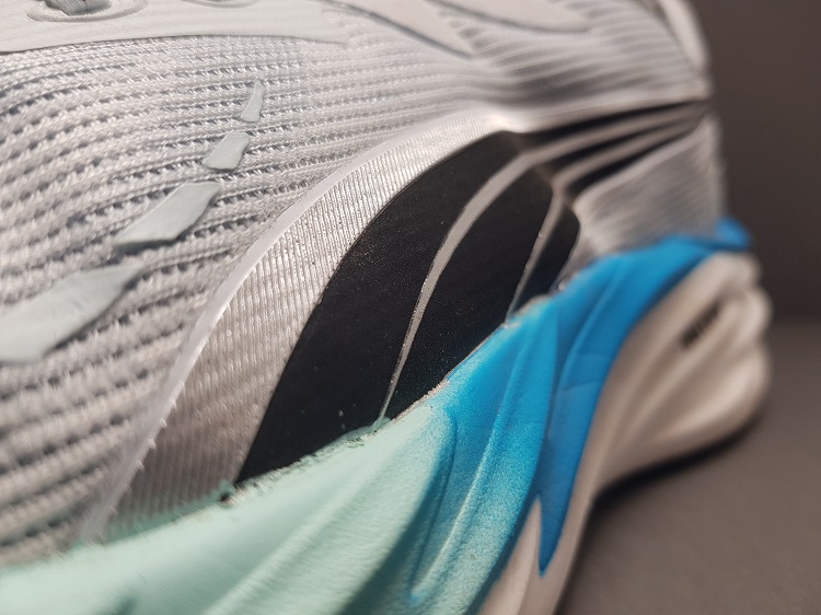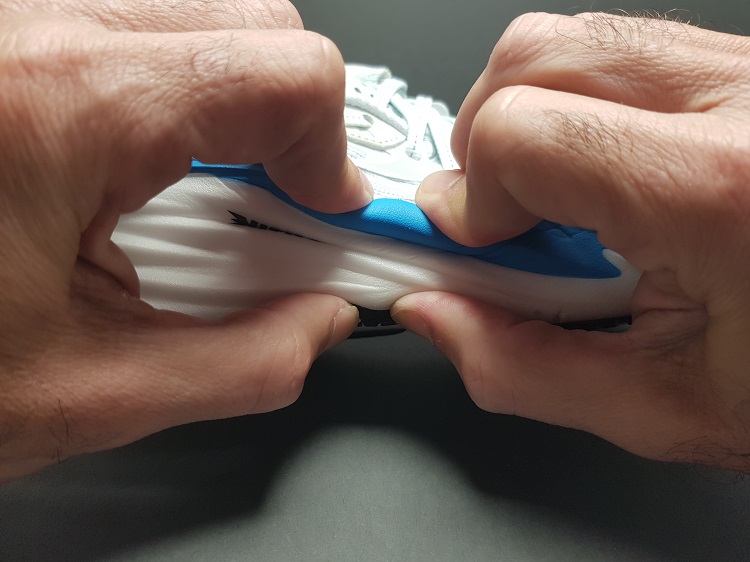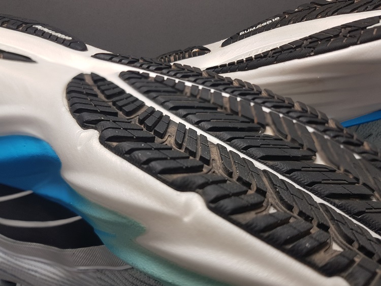 Ξεκινώντας από την αίσθηση της σόλας, αυτή διαφοροποείται στα δύο άκρα της. Λογικό με 10mm drop. Η φτέρνα είναι πολύ μαλακή αλλά συμπιέζεται και αποσυμπιέζεται πολύ γρήγορα, οπότε δεν μένεις μέσα της. Σχεδόν τερματίζει αλλά προλαβαίνει να σου δώσει όλο το cushioning που χρειάζεσαι προτού φύγεις από επάνω της.