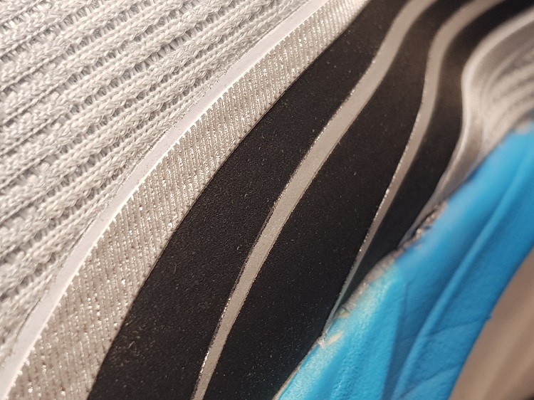 Το upper του Velocity είναι μάλλον υπερβολικό. Έχω χρόνια να δω τόσα δομικά στοιχεία μαζί και μάλιστα από τέτοια υλικά. Όπως θα δούμε και παρακάτω, η γραμμή του παπουτσιού είναι αρκετά στενή από μόνη της, οπότε η επιπλέον “θωράκιση” σίγουρα δεν ήταν απαραίτητη. Εκτός του ότι προσθέτει γραμμάρια χωρίς λόγο, δεν αφήνει αέρα στο ύφασμα να δουλέψει με το πόδι. Κι αυτό είναι πρόβλημα για έστω και ελαφρώς φαρδύτερα πέλματα. Απ’ την άλλη, για εκείνους με στενότερα η εφαρμογή κάθεται κυριολεκτικά γάντι.