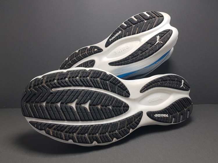Η εξώσολα καλύπτεται με λάστιχο σε όλη την επιφάνεια επαφής με το έδαφος. Όχι οποιοδήποτε λάστιχο φυσικά αλλά PumaGrip. Μιλάμε για το κορυφαίο επίπεδο πρόσφυσης αυτή την στιγμή, το οποίο δεν καταλαβαίνει από βρεγμένο, λείο ή σκονισμένο τερέν. Όλα αυτά τα βλέπει σαν γερμανική άσφαλτο. Το έχω ξαναγράψει αλλά ας το επαναλάβω. Μία φορά που είχε χιονίσει στην Αθήνα, βγήκα βράδυ και έτρεξα στην άκρη του δρόμου, επάνω σε παγωμένο/λιωμένο χιόνι, με το πρώτο Velocity. Και ένοιωθα ασφάλεια. Χρειάζεται να πούμε κάτι άλλο;